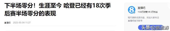 直播吧(下半场零分!生涯至今 哈登已经有18次季后赛半场零分的表现2025.05.04)