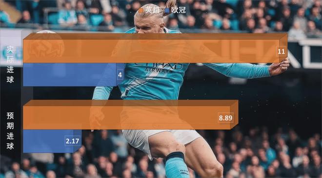 在英超和欧冠赛场,哈兰德的预期进球是11.06个,实际进球数达到了15个。实际进球比预期进球高出了36%,如此高效的原因除了哈兰德开发出头球,带来不同的得分方式,让对手原本的防守经验失效之外,还有哈兰德的逆足右脚得分效率也在提升。