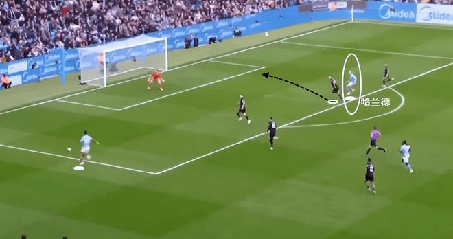 随后在3人包围圈下,及时把球传了出去。这也是哈兰德一个关键的进步点,他不只是能进球,同时在愿意参与防守的基础上,还能在反击推进时给队友送出一些不错的传球和起到串联进攻的作用。
